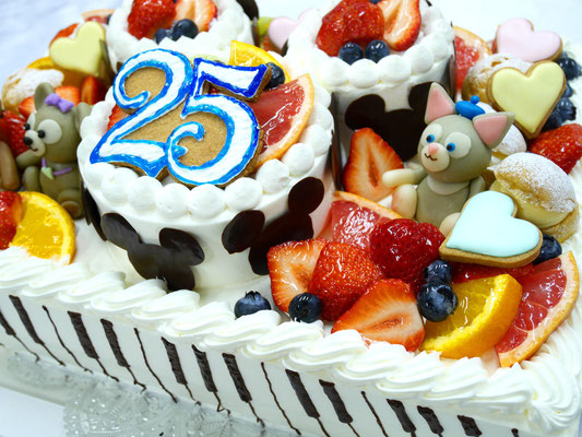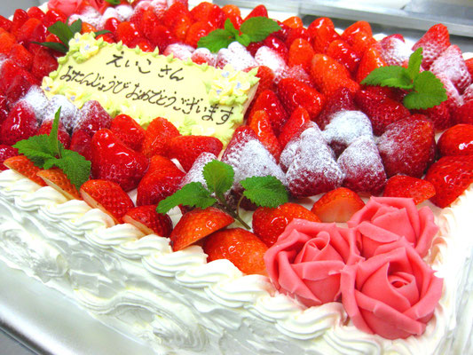 甘さ控えめの純生クリームでお作りしたデコレーションケーキになります。中はいちごをサンドしておりまして上部には季節のフルーツをたくさんお飾りしております。サイズ・形も応用がききますのでお気軽におしゃってくださいませ。